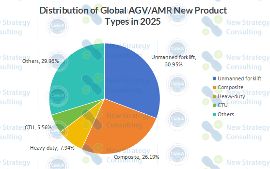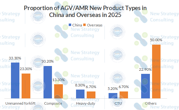 The chart showing the distribution of global AGV/AMR new product types in 2025 reveals a similar trend among Chinese and overseas companies in their product portfolios, both focusing on unmanned forklifts and composite robots. Specifically, the Chinese market is particularly concentrated, with over 60% of new products falling into these two categories, reflecting a strong demand for large-scale deployment and rapid adaptation to various scenarios. Meanwhile, overseas companies also invest a significant proportion of their resources in these two product categories.