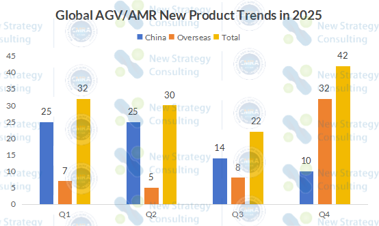 Throughout the Year Looking back at the whole year from the Q4, according to data from CMRA and incomplete statistics from NSRI, Chinese and overseas AGV/AMR companies released a total of 126 new mobile robot products in 2025. Of these, 96 were launched in the Chinese market, accounting for approximately 76.2%, while 30 were launched in the overseas market, accounting for approximately 23.8%. The Chinese market maintains its numerical advantage, driven by broader application demands and more frequent scenario testing. The overseas market, however, continues its trend of relatively restrained new product releases, but with higher maturity levels for individual products.
