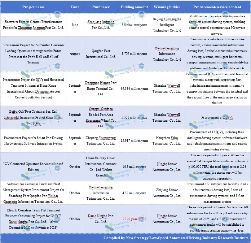 According to New Strategy Low-Speed Automated Driving All Media, these representative companies have not only established cooperative relationships with more ports domestically this year, demonstrating strong market competitiveness. For example, Senior Auto’s recent successful bid for the Ningbo-Zhoushan Port Daxie Terminal transportation project is its eighth publicly reported port autonomous driving project this year, making it the “bid king” in this field.