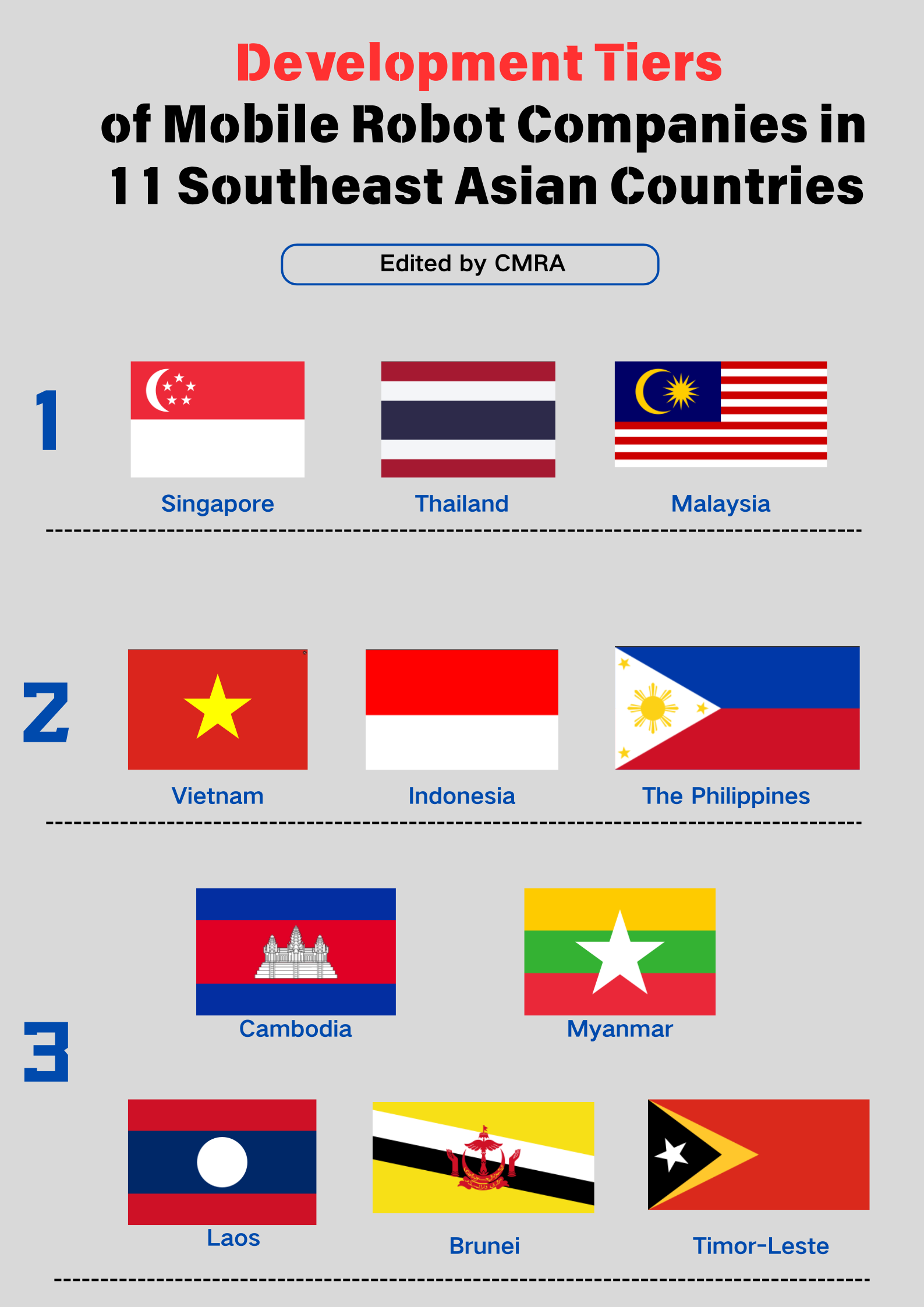 The term “disparity” aptly captures the supply landscape of mobile robotics in Southeast Asia. The region features both technology hubs like Singapore and Malaysia, manufacturing-driven application hotspots such as Vietnam and Thailand, and underdeveloped markets including Laos and Brunei. Based on the operational activity and growth potential of local mobile robotics enterprises, the 11 Southeast Asian countries can be clearly categorized into three tiers.