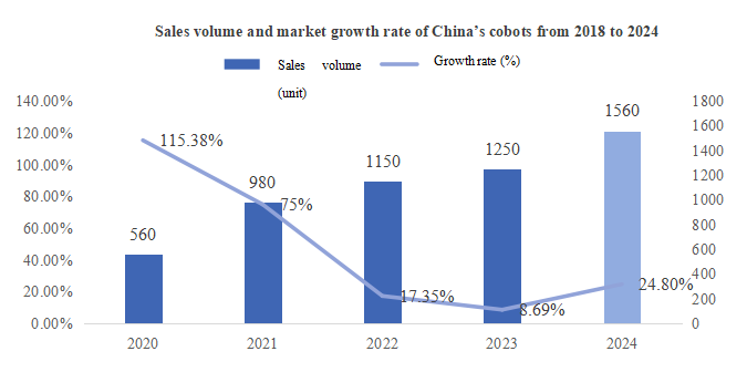 Chart: Sales volume and market growth rate of China’s cobots from 2018 to 2024