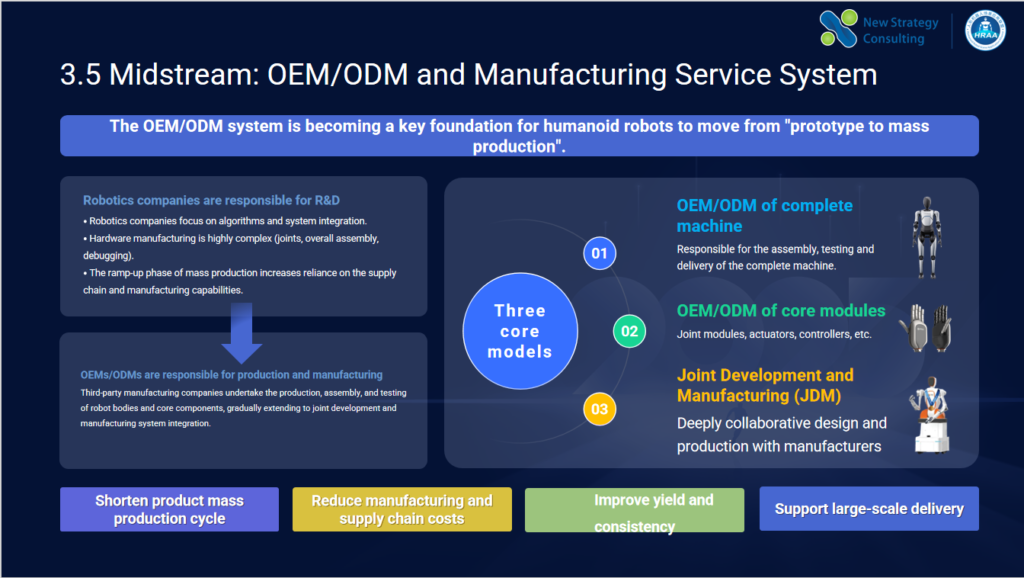 The Humanoid Robot Industry Development Research Report 2026 points out that the OEM/ODM system is becoming a key foundation for robots to move from prototypes to large-scale production, and is gradually differentiating into three paths during its development: OEM/ODM of complete machine, OEM/ODM of core modules, and joint development and manufacturing (JDM).