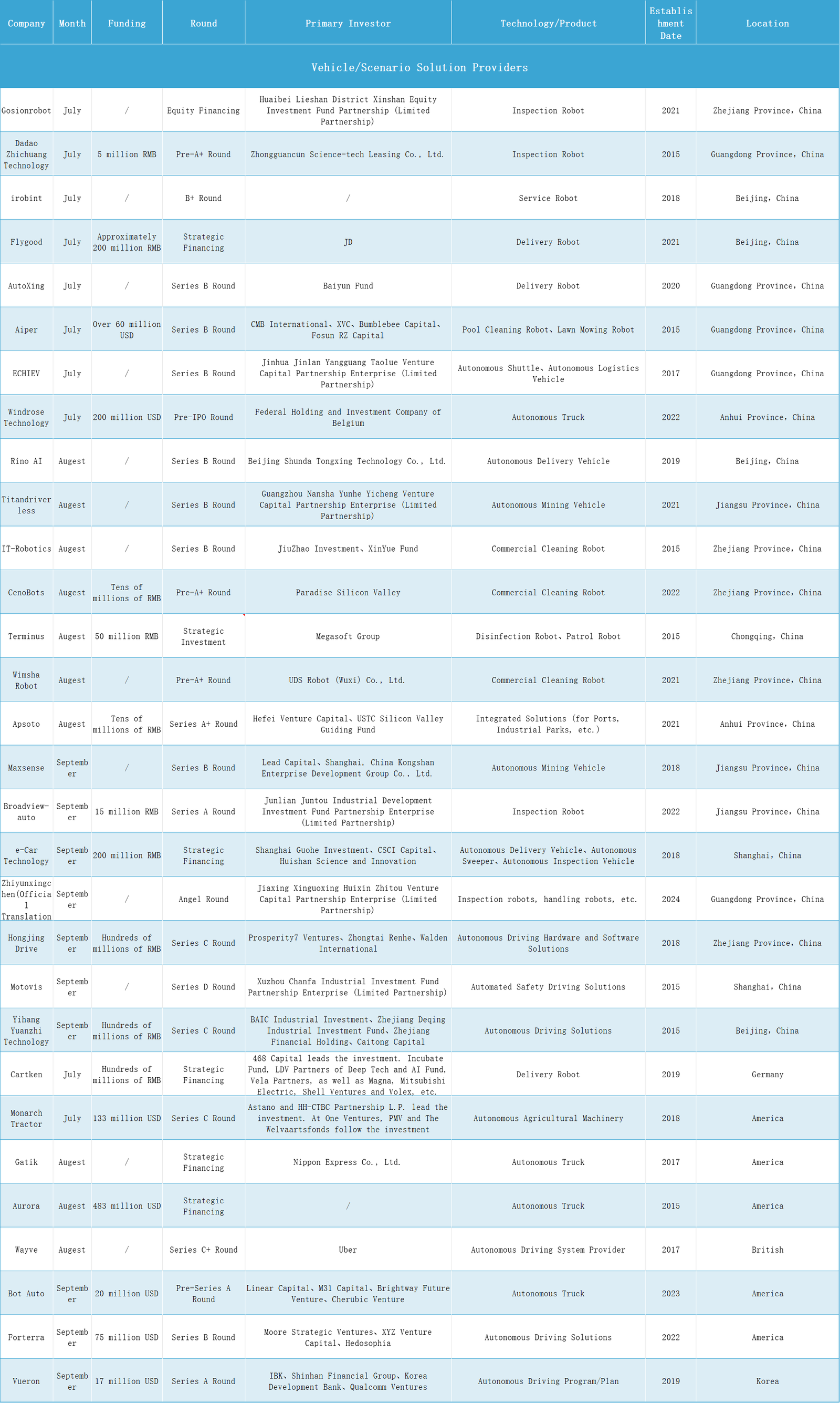 By financing domain, most investments were directed toward vehicle/scenario solution providers, with 30 companies reporting over 7.8 billion RMB. This suggests a focus on companies that have achieved early commercialization and profitability in specific application scenarios. In particular, autonomous delivery companies saw the most financing events, with six companies disclosing over 470 million RMB in total funding.
