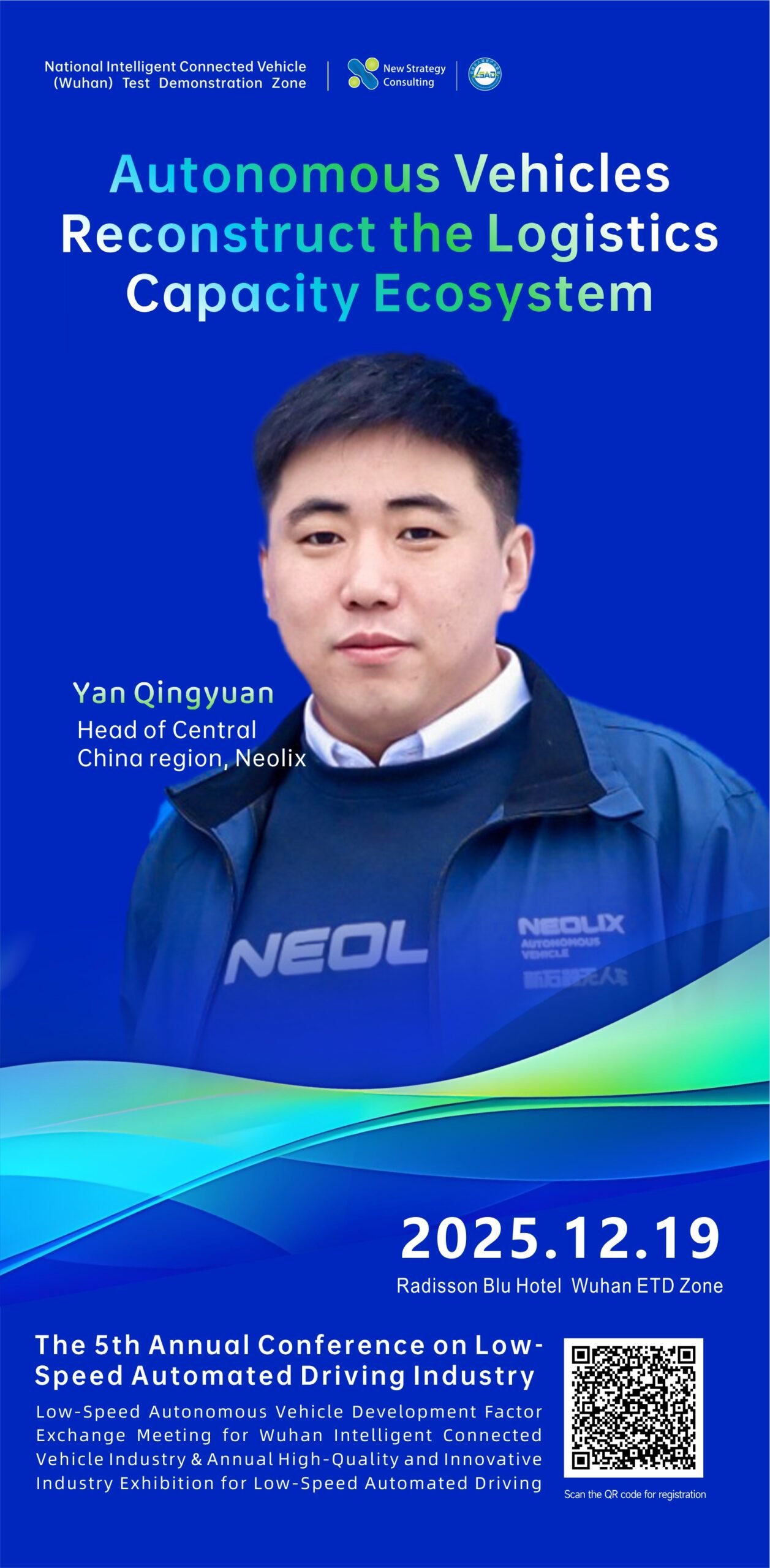 At the “5th Annual Conference on Low-Speed Automated Driving Industry” held on December 19, 2025, Yan Qingyuan, Head of Central China region, Neolix, will deliver a keynote speech entitled “Autonomous Vehicles Reconstruct the Logistics Capacity Ecosystem.” He will share in-depth insights based on rich practical cases on how autonomous driving technology can be truly implemented and profoundly influence and even reshape the future logistics capacity system.