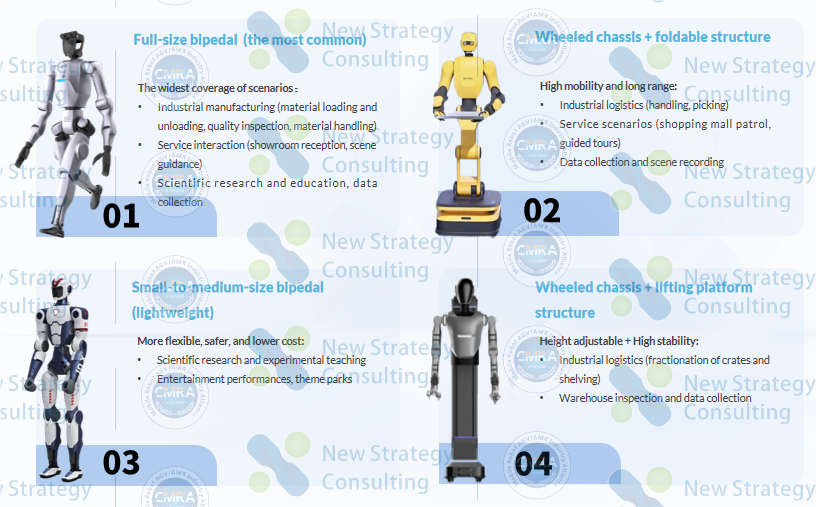 Based on specific product structures, the industry has currently converged into four mainstream forms: full-size bipedal, small-to-medium-size bipedal, wheeled chassis with folding upper limbs, and wheeled chassis with lifting structures.