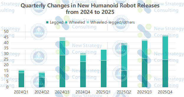 Looking at the quarterly distribution, the release of new humanoid robots in 2025 exhibits a clear multi-peak characteristic. Legged robots are concentrated in Q1 and Q3, while wheeled robots see a significant increase in Q2 and Q4, showing differentiated choices in release timing based on different technological approaches and product positioning.
