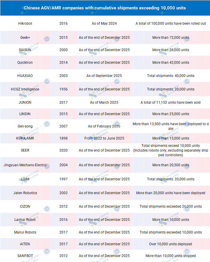 According to research and statistics from China Mobile Robot Industry Alliance (CMRA) and New Strategy Mobile Robot Industry Research Institute (NSRI), more than 20 AGV/AMR companies in China have achieved a cumulative shipment of over 10,000 units, marking the transition of the domestic mobile robot industry from technology verification and small-scale pilot projects to a mature stage of large-scale mass production and large-scale deployment.