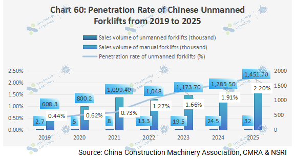 Chart 60 shows that from 2019 to 2025, the sales volume of unmanned forklifts in Chinese market increased from 2,700 to 32,000, growing by more than 11 times in 7 years. The penetration rate rose from 0.44% in 2019 to 2.20% in 2025, increasing by 5 times in 7 years. Moreover, the growth rate became steeper year by year, indicating that the process of unmanned substitution is accelerating. The sales volume of manual forklifts have increased by 138.6% over the past 7 years, indicating that the traditional forklift market is still expanding steadily. The basic handling demands in industries such as logistics and manufacturing remain strong. The growth of manual forklifts provides a vast alternative space for unmanned forklifts: even if the penetration rate increases by only 1 percentage point, the corresponding new sales of unmanned forklifts would exceed 14,000, and the market potential is enormous.