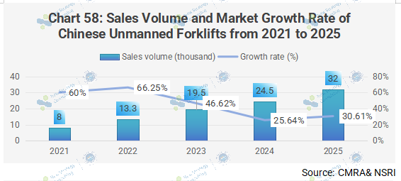 According to the data from China Mobile Robot Industry Alliance (CMRA) and the statistics of New Strategy Mobile Robot Industry Research Institute (NSRI), the sales volume of unmanned forklifts in China was 32,000 in 2025, representing a year-on-year growth of 30.61%, maintaining a relatively rapid growth rate. Thanks to the increase in labor costs, the acceleration of factory automation transformation, the maturity of navigation technology and the cost reduction of core components, unmanned forklifts have become standard equipment in manufacturing, warehousing, new energy, pharmaceuticals, cold chain and other scenarios, and the market penetration rate continues to rise.