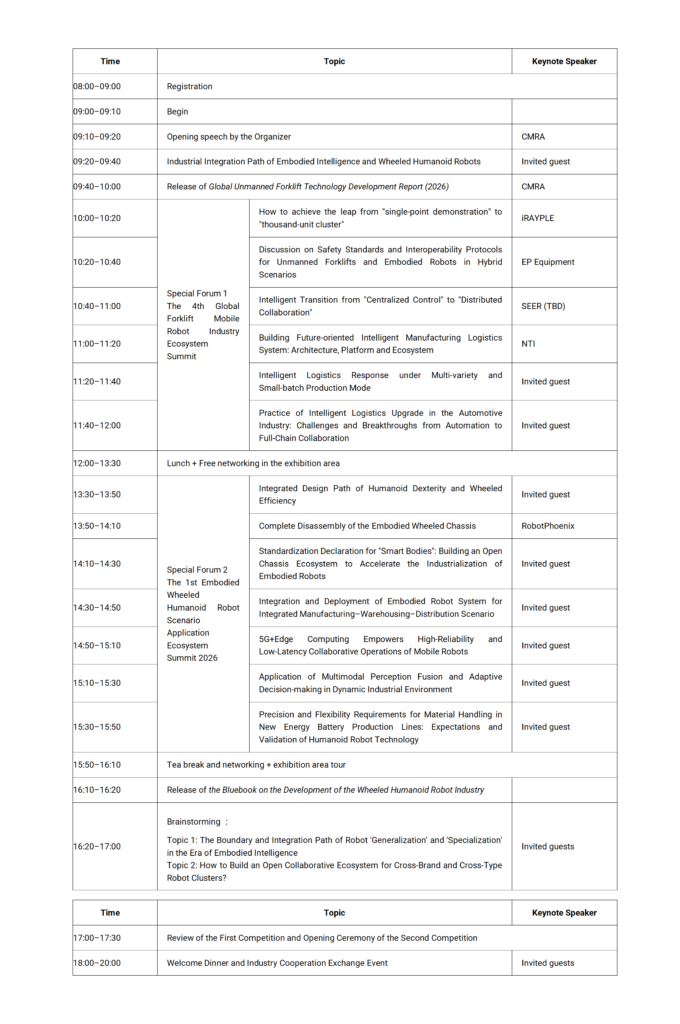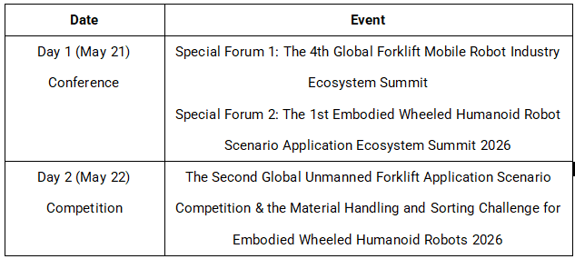 Day 2 (May 22): The Second Global Unmanned Forklift Application Scenario Competition & the Material Handling and Sorting Challenge for Embodied Wheeled Humanoid Robots 2026